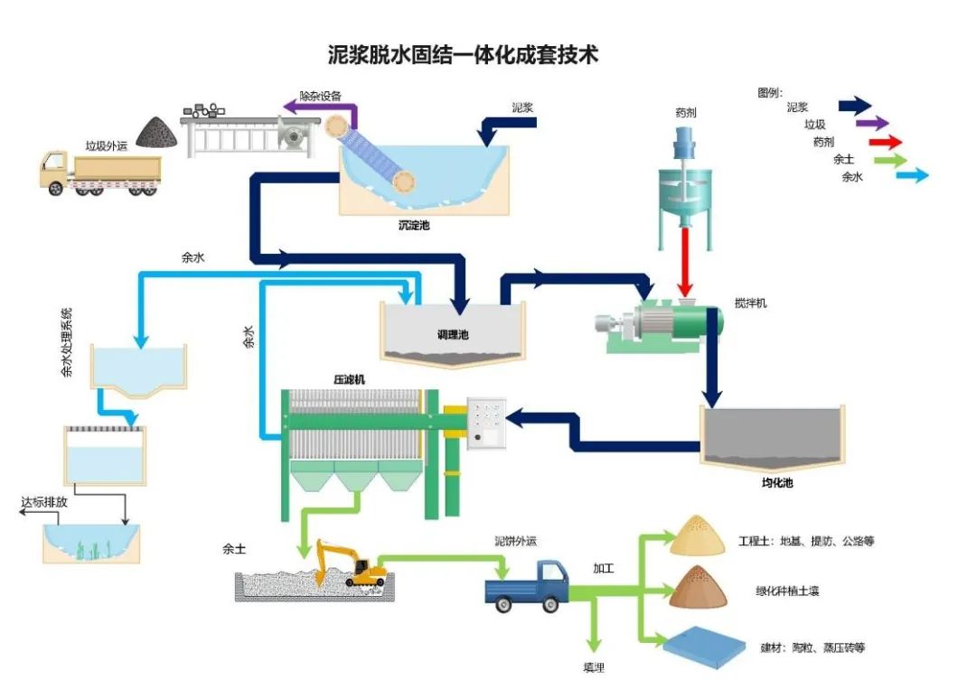 一是路德環(huán)境淤泥固化處理中心采用創(chuàng)新淤泥脫水固結(jié)一體化處理技術(shù)體系。河道、暗涵、管網(wǎng)所清淤泥,經(jīng)全封閉運(yùn)輸送往項(xiàng)目底泥處理廠,經(jīng)除雜、除渣、調(diào)節(jié)、加藥均化后進(jìn)行板框脫水,脫水固結(jié)成可再生使用泥餅,泥餅含水量可降至40%以下,實(shí)現(xiàn)淤泥無(wú)害化處理。