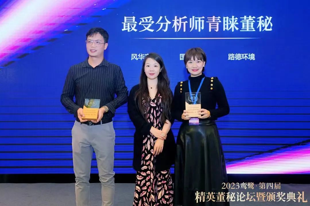 會上,“第四屆精英董秘評選”榜單揭曉,路德環(huán)境副總經(jīng)理、董事會秘書劉菁女士榮獲“最受分析師青睞董秘”獎項。