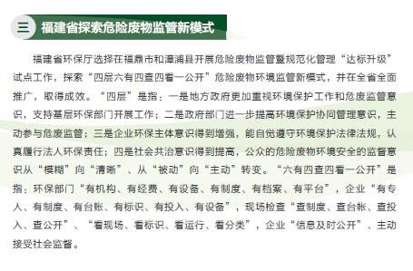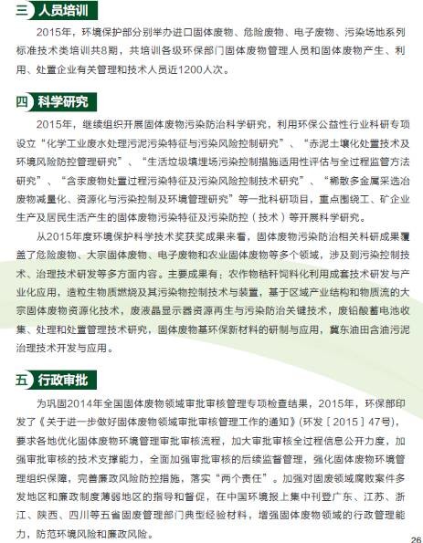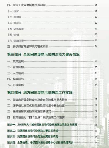 《年報》還介紹了我國現(xiàn)行固體廢物污染防治主要政策法規(guī)、固體廢物管理機構(gòu)能力建設(shè)情況、固體廢物管理技術(shù)培訓(xùn)情況以及固體廢物污染防治相關(guān)科研成果。并選擇4個代表性省份,介紹了他們在解決固體廢物管理重點、難點問題方面的經(jīng)驗和做法。